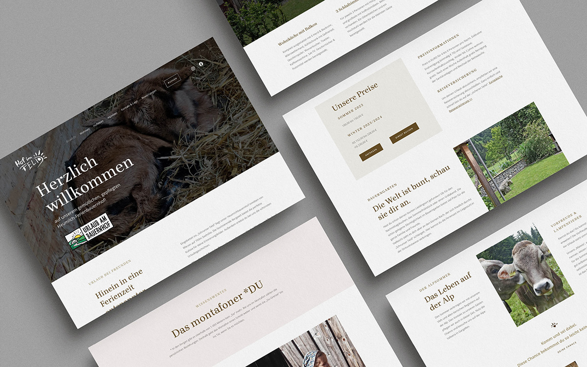 Hof im Feld ist ein idyllisch eingebetteter Bauernhof im „Schrunser Feld“. Die Webseite hatte schon ein paar Jahre gedient und entsprach nicht mehr den zeitlichen Ansprüchen. Ebenso fehlte es an Emotion durch eine offene Bildsprache. Tatsächlich kann man sagen der Urlaub am Bauernhof wurde nicht wirklich vermittelt.